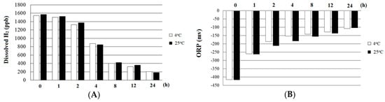 (A) Stability of dissolved H2 and (B) the ORP of hydrogen-rich water at 4 °C and 25 °C. ORP, oxidation-reduction potential.