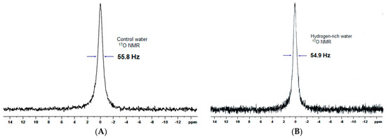 17O Nuclear magnetic resonance line-width of water samples: (A) Control water and (B) hydrogen-rich water.