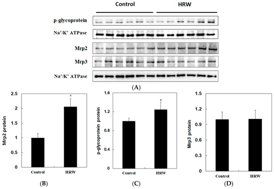 Effects of intake of HRW on p-glycoprotein and Mrp2/3 protein expression in liver of rats (A). Protein expression was determined by Western blotting. Densitometric analysis for Mrp2 (B), p-glycoprotein (C) and Mrp3 (D) protein levels corrected to each internal control is shown. The results are expressed as the mean ± S.D. of six rats. Na+/K+ ATPase acts as an internal control. The protein band was quantified by densitometry, and the level of the control was set at 1. * Significantly different from the control group at p < 0.05.
