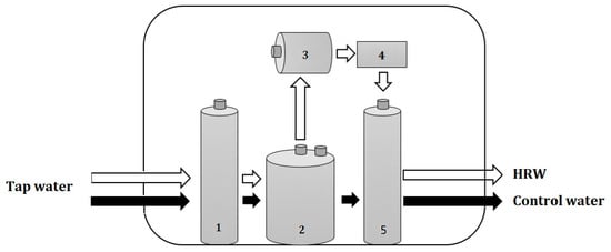 Schemes of the manufacturing process for control water and HRW from tap water: 1. Calcined ceramic filter; 2. activated carbon filter; and 3. magnesium–carbon hydrogen storage hybrid materials. Water reacted with this material and then release stable H2 gas; 4. activated carbon filter; 5. magnetized rod.