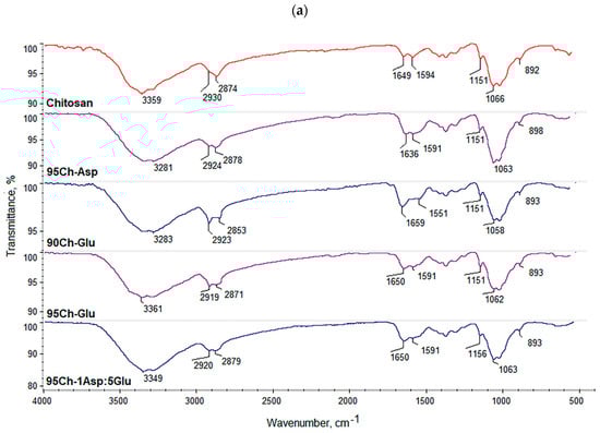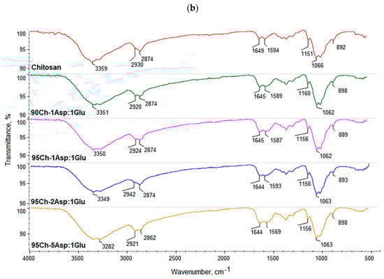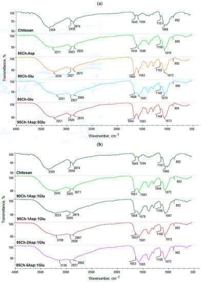 (a,b) FT-IR spectra of the pure chitosan and the aerogels prepared via chitosan crosslinking using glutamic and aspartic acid.