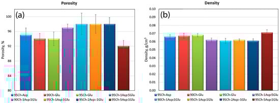 It can be noticed that all of the samples have excellent porosity that is above 90% which suggests that the polymeric materials will be able to absorb a high amount of aquatic solutions and take part in blood clot formation (Figure 3) [35]. High porosity is an effect of the crosslinking process as well as lyophilization. The highest porosity occurred in samples containing both amino acids in their structure, however only until a certain point. The lowest porosity (95Ch-5Asp:1Glu) is assigned to the high number of amide bonds and branched structure as a result of intense crosslinking. The presence of pores is strongly correlated with the swelling abilities of potential hemostatic agents. All samples also have very low density, typical for aerogels (Figure 4).