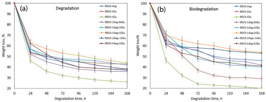 As shown at Figure 6a,b, all of the samples lost their weight even up to 80%. The FT-IR spectra (Figure 7a,b) show that the weight loss occurred as a result of amide bonds hydrolysis in the first place as well as an enzymatic break of β-glycosidic bonds between chitosan mers. However, it seems that lysozyme activity did not have a significant impact on biomaterials disintegration during the first days of biodegradation. The FT-IR study showed that in the first stage of biodegradation, incorporated amino acids are removed from the polymeric backbone which confirms a significant decrease in the intensity of bands typical for amide bonds and free amino groups. At the same time the changes in the intensity of bands coming from pyranose rings as well as -O- bridges between polymeric units are very small. It can be noticed, that FT-IR spectra of hemostatic agents after seven days of incubation in SBF containing lysozyme are almost identical with FT-IR of the native chitosan. Therefore, it can be stated that biodegradation occurs in two stages. In the first one, chitosan changes its structure from branched to linear, whereas in the second stage polymer transforms into oligomers which may be incorporated into certain cell cycles as well as naturally removed from the body with other fluids. It may also be assumed that the slow release of amino acids (l-aspartic and l-alutamic acids) will not cause any significant pyrogenic states since they naturally occur in the human body and have lower acidity than, for example, lactic acid. The obtained data demonstrate that all samples are biodegradable and may be applied in vivo during surgeries without the necessity of reoperation of the patient after some period of time.