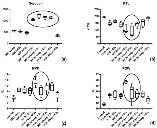 Platelet (PLT) levels after blood clotting test can show their involvement in clot formation during hemostasis. The ANOVA test demonstrates the significant difference in PLT level within all groups (p ≤ 0.0001). Multiple comparisons analysis shown that PLT concentration in blood after immersion of 95Ch-1Asp:5Glu, 90Ch-1Asp:1Glu and 95Ch-1Asp:1Glu sponges was significantly lower to control and other groups (p ≤ 0.0001 and p ≤ 0.001). It must be noted that PLT levels in 95Ch-5Asp:1Glu group do not significantly differ from the control (p = 0.79). MPV (mean platelet volume) and PDW (platelet distribution width) are parameters that depend on PLT shape that will change during the blood clotting process. Interaction of chitosan sponges with blood leads to significant increases of both parameters (ANOVA, p ≤ 0.0001), but MPV and PDW in 95Ch-5Asp:1Glu group did not differ from the control blood according to the multiple comparison analysis (p = 0.072 and p = 0.32). PLT parameters correlate with their number in blood after clotting—the same 95Ch-1Asp:5Glu, 90Ch-1Asp:1Glu, 95Ch-1Asp:1Glu sponges lead to significant MPV and PDW elevation. The results show that proposed biomaterials have higher hemostatic activity when compared to pure chitosan [2].