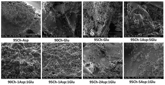 SEM shows (Figure 9) blood cell distribution over the sponges, but the number of cells is different and dependent on sponge type. Blood cells mostly completely cover 95Ch-Glu, 95Ch-1Asp:5Glu, 90Ch-1Asp:1Glu and 95Ch-1Asp:1Glu samples and penetrate to the pores. Other samples gave less cells that form separate aggregates and did not firmly connect with the sponge’s surface. We can see soft substance over the cells in 95Ch-1Asp:5Glu, 90Ch-1Asp:1Glu and 95Ch-1Asp:1Glu samples that are probably blood proteins, including thrombin that is the main component of a blood clot. We can observe that this substance makes a connection between cells and sponge. The results of the cells adhesion are superior to those obtained with pristine chitosan [2]. The results correspond to the data collected by other researchers [31,32,33].