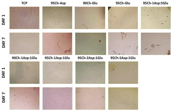 Optical image of human cell primary fibroblasts at one and seven days after cultivation with chitosan sponges. (TCP—tissue culture plastic). Magnification X200.