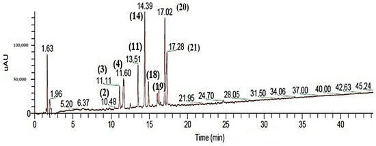 Phytochemical analysis of the hydroalcoholic fruit extract of Styphnolobium japonicum was performed using HPLC-PDA-ESI-MS/MS technique, see Figure 1 [21]. Several classes of secondary metabolites were detected as phenolic acids, flavones, flavan-3-ols, and tannins.