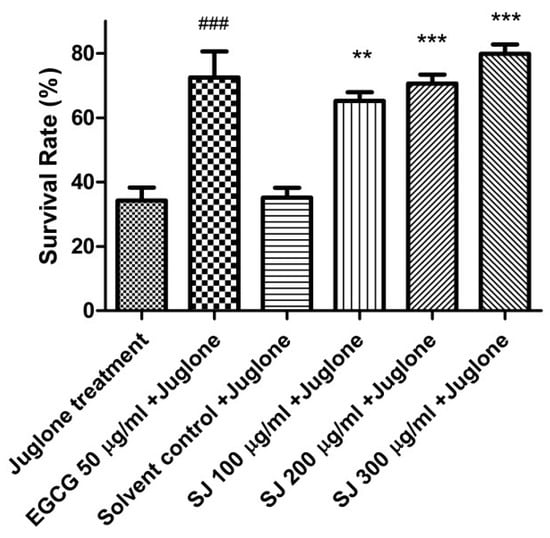 Several assays were employed to evaluate the antioxidant effects of SJ extract in vivo using the widely known C. elegans model. For the survival assay, a lethal dose of the naphthoquinone juglone was applied as a pro-oxidant for the induction of severe oxidative stress condition. Worms that were pretreated with SJ extract demonstrated significantly higher rates of survival, compared with the solvent control group. The highest dose of the extract—SJ 300 µg/mL—demonstrated the highest survival rate among all the tested doses, 79.86 ± 2.87%, compared to the juglone group (35.15 ± 3.06%, p-value < 0.001) (Figure 2). This result was even higher than that of the EGCG positive control group (72.46 ± 8.1%, p-value < 0.001). This data demonstrates the bioavailability of the extract.