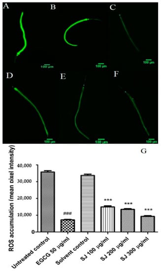 Intracellular reactive oxygen species (ROS) levels in C. elegans. (A–F) Pictures demonstrate intracellular ROS levels in worms: (A) untreated control, (B) solvent control, (C) (−)-epigallocatechingallate (EGCG) 50 µg/mL, (D) SJ 100 µg/mL, (E) SJ 200 µg/mL, (F) SJ 300 µg/mL, and (G) quantification of ROS levels using fluorescence intensity for different treated groups. SJ treatment resulted into lower ROS levels. Data represents the mean of three assays. Analysis was made through one-way ANOVA followed by Bonferroni’s method. *** p < 0.001 in comparison with solvent control and ### p < 0.001 in comparison with untreated control.