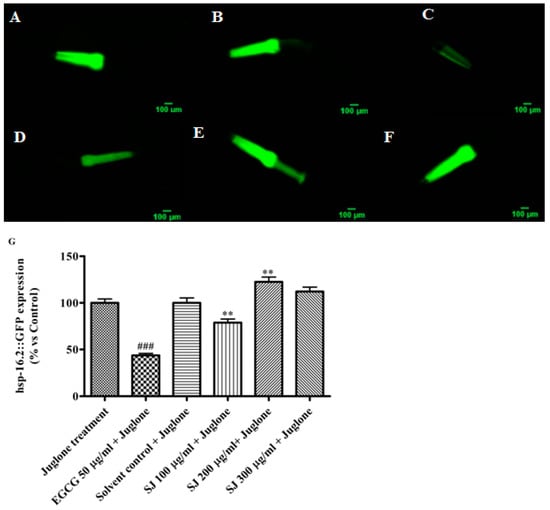 Hsp-16.2 gene expression in C. elegans. (A–F) GFP images of TJ375 worms from different treatment groups: (A) juglone group, (B) solvent control + juglone, (C) EGCG 50 µg/mL + juglone, (D) SJ 100 µg/mL + juglone, (E) SJ 200 µg/mL + juglone, (F) SJ 300 µg/mL + juglone, and (G) quantification of Hsp-16.2 levels using fluorescence intensity measurement for different groups. The lowest concentration of SJ extract used—SJ 100 µg/mL—resulted in significantly decreased expression of Hsp-16.2 gene. Data represent the mean of four assays. Analysis was performed through one-way ANOVA followed by Bonferroni’s method. ** p < 0.01 in comparison with solvent control + juglone and ### p < 0.001 in comparison with juglone group.