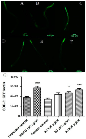 Expression of Sod-3 gene in C. elegans. (A–F) Photos of GFP fluorescence in the posterior part of the intestine of CF1553 worms from different treatment groups: (A) untreated control group, (B) solvent control, (C) EGCG 100 µg/mL, (D) SJ 100 µg/mL, (E) SJ 200 µg/mL, (F) SJ 300 µg/mL, and (G) quantification of sod-3 levels through fluorescence intensity measurement for different groups. The highest concentration of SJ extract used—SJ 300 µg/mL—resulted in significant expression of sod-3 gene. Data is represented as mean of three assays analyzed through one-way ANOVA followed by Bonferroni’s method. * p < 0.05, *** p < 0.001 in comparison with solvent control and ### p < 0.001 in comparison with untreated control group.