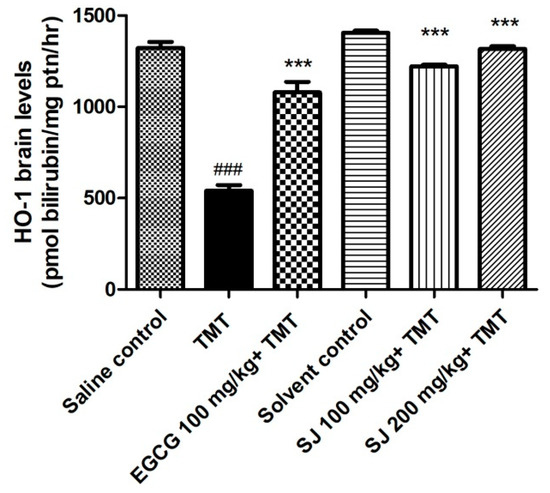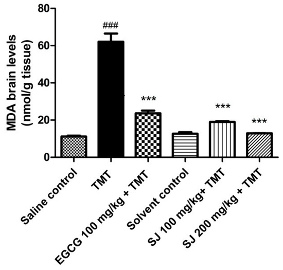 Mice that received TMT manifested increment in the levels of MDA by 4.5-fold, compared to saline control group (p < 0.001). Mice pretreated with SJ extract showed significant depression in MDA levels as compared to the TMT group. The higher dose, SJ 200 mg/kg, showed a higher decline in MDA levels by 79.25 ± 0.09%; a result that is even higher than that of the group pretreated with EGCG (61.9 ± 1.47%, p < 0.001) (Figure 6). This result is similar to that observed in TMT mouse model using a Ginkgo biloba extract [58]. A proanthocyanidin-rich extract from Cassia abbreviata was also able to decrease MDA levels in rats [37].