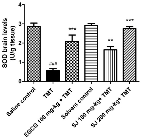 To highlight on the possible involvement of antioxidant enzymes in the action of SJ extract, total SOD levels were measured in brains of mice. Acute administration of TMT to mice resulted into 80 ± 0.1% decline in the levels of SOD enzyme in the brains in comparison with saline control group (p < 0.001). This effect was reported previously using the TMT-induced neurotoxicity model [50,58]. Treatment with SJ extract counteracted the decline in SOD enzyme levels in a dose-dependent way. The used doses showed significantly higher SOD levels compared to TMT treated group. SJ 200 mg/kg group showed improvement in SOD levels by 92.9 ± 0.11% (p < 0.001). EGCG also demonstrated a significant elevation in SOD levels in comparison with that of TMT group (64.9 ± 0.32%, p < 0.001) (Figure 7).