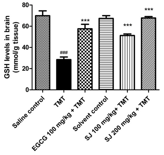 In the current study, the TMT treated mice demonstrated a highly significant decline of GSH to 59.16 ± 2.42% relative to saline control group (p < 0.001). Similarly, it was reported previously that the levels of GSH were reduced in the hippocampus of mice after administration of TMT [51]. However, groups treated with SJ extract showed higher GSH levels compared to TMT treated group. SJ 200 mg/kg treated group revealed 90.77 ± 1.32% elevation in GSH levels in the brain (p < 0.001). EGCG treated group showed highly significant result of 70.2 ± 4.24% elevation in GSH levels (p < 0.001) (Figure 8).