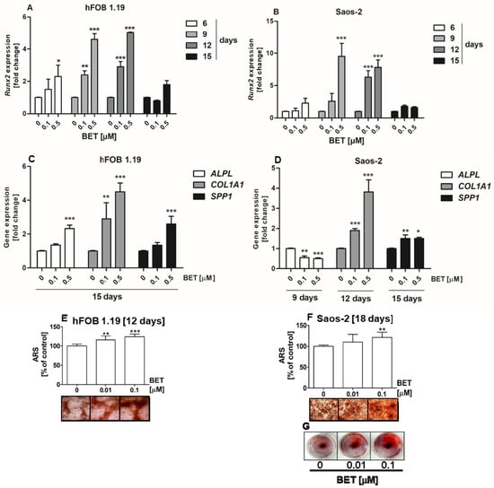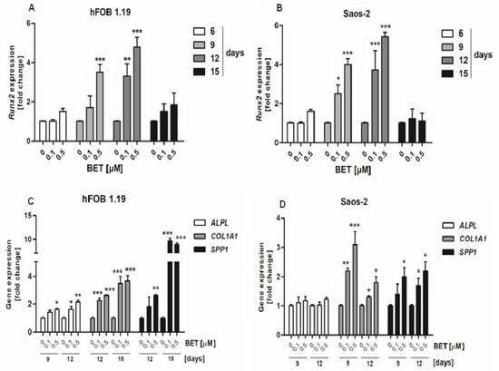 Moreover, we carried out an assay of osteoblast differentiation in media without additional osteogenic supplements (ascorbic acid) to evaluate whether BET alone possesses the activity to regulate osteogenesis. As shown in Figure 4A and B, BET (0.1 and 0.5 µM) increased the expression of the RUNX2 gene in both the hFOB1.19 and Saos-2 cells. Statistically significant increases in the RUNX2 mRNA levels in the BET-treated osteoblasts were detected at day 6, 9, and 12 of osteoblast cultures. Further investigations revealed that BET also induced the expression of other osteoblast differentiation marker genes and enhanced mineralization, i.e., the final step of this process. As shown in Figure 4C,D, at a concentration of 0.1 and/or 0.5 µM, BET elevated the expression of all tested differentiation makers, except ALPL in the Saos-2 cells, at the indicated culture time.