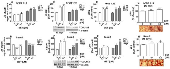 Next, we evaluated the ALP activity and production of COL1A1 and OPN by osteoblasts to confirm additionally that BET promotes differentiation of osteoblasts. In this part of the study, BET was used in very low concentrations such as 0.01 and 0.1 µM. As shown in Figure 3A, the ALP activity in the hFOB 1.19 cell cultures started to increase at day 9 of incubation with 0.1 µM BET. Then, ALP reached maximal activity after treatment with 0.01 and 0.1 µM of BET at day 12 of culture. In contrast, a statistically significant decrease in the ALP activity was observed in the Saos-2 cell cultures at the same time points (Figure 3B). Moreover, western blot analysis revealed that BET enhanced the production of COL1A1 in the hFOB 1.19 and Saos-2 cells in a concentration-dependent manner, compared with the controls (Figure 3C,D). As shown in Figure 3E,F, the treatment of both cell lines with BET also enhanced the production of OPN after 12 days of incubation. In the case of the hFOB 1.19 cells, a similar effect of the triterpene treatment was also observed at day 15 of culture.