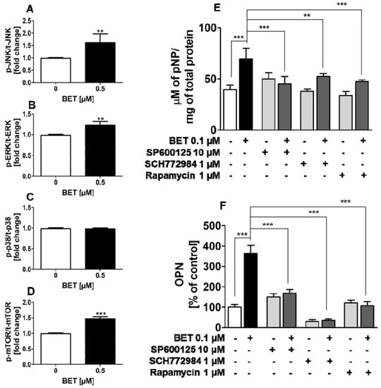 Effect of BET on the activation of JNK, ERK1/2, p38, and mTOR kinases in the hFOB 1.19 cells (A–D). Effects of JNK, ERK, and mTOR inhibitors on the levels of BET-induced ALP (E) and OPN (F). The cells were cultured in an osteoinductive medium with BET at a concentration of 0.5 µM or without the compound (control) for 6 h (JNK, ERK1/2, p38) or 24 h (mTOR). The levels of JNK (A), ERK1/2 (B), p38 (C), and mTOR (D) phosphorylation in the hFOB1.19 cells were evaluated with the ELISA method. The hFOB 1.19 cells were cultured in an osteoinductive medium with BET at a concentration of 0.1 µM or co-treated with SP600125 (5 µM), rapamycin (1 µM), or SCH772984 (1 µM). The osteoinductive medium supplemented with BET or BET plus the inhibitor was changed every three days. ALP activity was evaluated after 6 days with the colorimetric method with pNPP as a substrate for ALP. The OPN levels were measured after 9 days with the ELISA method. Mean ± SD from three independent experiments; ** p < 0.01, *** p < 0.001 in comparison to the control, one-way ANOVA with post hoc Dunnett’s test (A–D) and Tukey’s test (E,F).