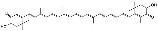 AST can be isolated mostly from microalgae Haematococcus pluvialis. However, shrimp, asteroidean, algae, lobster, crustacean, krill, trout, red sea bream, and salmon as marine animals and seafood are considered as other sources of extraction [4]. AST is chemically known as 3,3′-dihydroxy-β, β′-carotene-4,4′-dione (Figure 1), with the molecular formula of C40H52O4 [14]. It possesses a linear polar-nonpolar-polar structure with keto- and hydroxyl moieties at polar ends and conjugated carbon-carbon double bonds at a non-polar middle part, which allows it to fit specifically into the same span of cell membranes and pass through blood-brain barrier (BBB) [15].