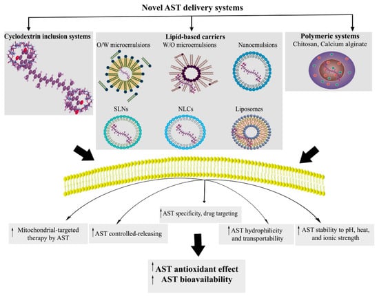 In general, the novel delivery systems of AST, including lipid carriers, mitochondrial targeted, polymeric, and cyclodextrin inclusion systems, could be considered as new ways to potentiate the effects of AST by improving its stability, hydrophilicity, and antioxidant capacity to be used in several diseases (i.e., neurodegenerative disorders).