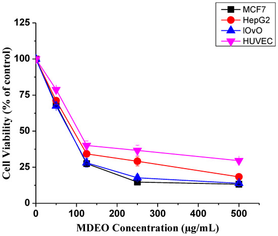 Cytotoxic effect of MDEO on different cancer cells. Dose-dependent curves treatment in MCF-7 (breast cancer), HepG2, LoVo (colon cancer), and human umbilical vein endothelial cell line (HUVEC) cells. Cells were cultured in 24-well plates and treated with different concentrations (50–500 µg/mL) for 48 h. Cell viability was measured by MTT assay. Data represent the mean ± S.D of three independent experiments carried out in triplicates.