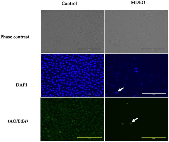 As shown in Figure 3, control cells retained their cellular morphology and confluency and were oval, intact, and uniformly stained. In contrast, treated cells with MDEO showed strong effects on cell morphology as was obvious from the densities decrease of the cells, the shrinkage detachment, and the loss of cell integrity. The typical marks of apoptosis were also evident in the treated cells (Figure 3).
