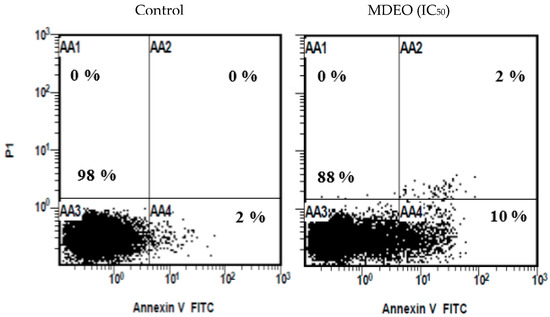 The apoptosis induction was confirmed quantitatively using flow cytometer analysis. The cells were labeled with Annexin VFITC and/or propidium iodide (PI) dyes (Figure 4). It was shown that the cells were split into four quadrates based on the cell stages: viable, early apoptosis, late apoptosis, and necrosis quadrates. At 24 h of treatment, MDEO induced apoptosis to the treated MCF-7 cell lines. There was no apoptosis (0%) in the untreated cells, indicating that the treatment with the essential oil caused induction of apoptosis. As the time of treatment increased to 24 h, the percentage of apoptotic cells (early and late) also increased proportionally to time of exposure.