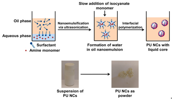 - Johnsen, H.; Schmid, R.B. Preparation of polyurethane nanocapsules by miniemulsion polyaddition. J. Microencapsul. 2007, 24, 731–742. [Google Scholar] [CrossRef] [PubMed]