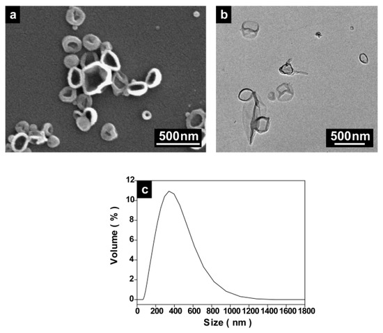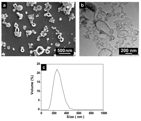 (a) SEM, (b) TEM, and (c) the size distribution of PU NCs prepared using 4,4′-MDI and a mixture of DETA and EDA as the monomers (PU-9).