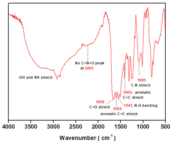 The complete polymerization of the amine with the isocyanate monomers was revealed by Fourier transform infrared (FTIR) analysis (Figure 7). The presence of absorbance peaks above 3000 cm−1, which correspond to the overlapping stretching vibrations of the N–H and –OH (from water) groups, and an absorption band at 1659 cm−1 assigned to C=O stretching vibrations, indicate the formation of polyurea [18]. In addition, the absence of the absorbance peak of the isocyanate group (–C=N=O) at 2260 cm−1 indicates the complete consumption of the isocyanate monomer. Furthermore, absorbance peaks at 1599 cm−1 and 1409 cm−1 can be attributed to C=C stretching vibrations of aromatic rings. The absorbance bands at 2852 and 2922 cm−1 are ascribed to sp3-hybridized C–H, and the peak at 3028 cm−1 is attributed to sp2 C–H stretching vibrations. In addition, absorbance bands at 1541 and 1095 cm−1 are ascribed to the secondary N–H bending and the C–N stretching vibrations, respectively.