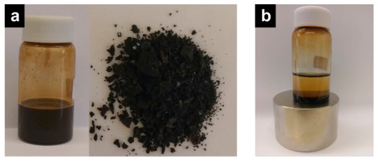 (a) MNPs-IL-C4@PU NCs as suspension and powder and (b) a magnetic separation of MNPs-IL-C4@PU NCs.