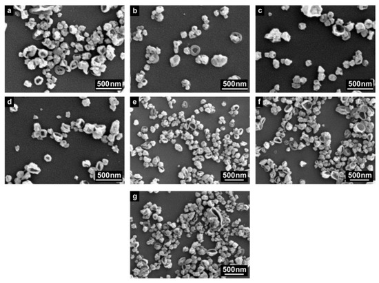 SEM images of MNPs-IL-C4@PU NCs. (a) 1% (PU-15a), (b) 2% (PU-15b), (c) 3% (PU-15c), (d) 5% (PU-15d), (e) 7% (PU-15e), (f) 9% (PU-15f), and (g) 11% (PU-15g) of encapsulated MNPs-IL-C4.