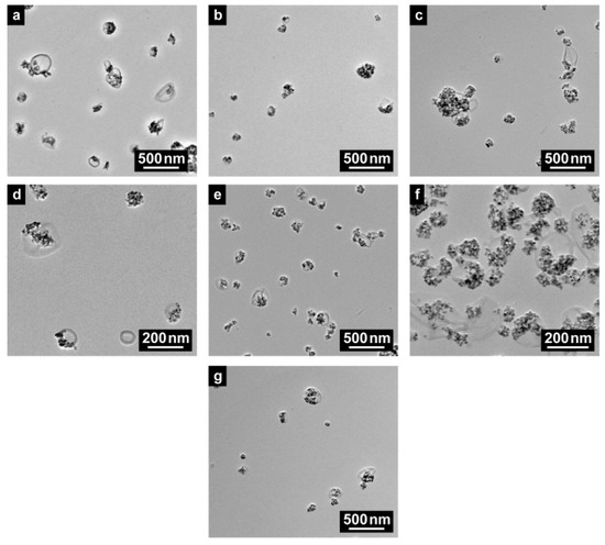 TEM images of MNPs-IL-C4@PU NCs. (a) 1% (PU-15a), (b) 2% (PU-15b), (c) 3% (PU-15c), (d) 5% (PU-15d), (e) 7% (PU-15e), (f) 9% (PU-15f), and (g) 11% (PU-15g) of encapsulated MNPs-IL-C4.
