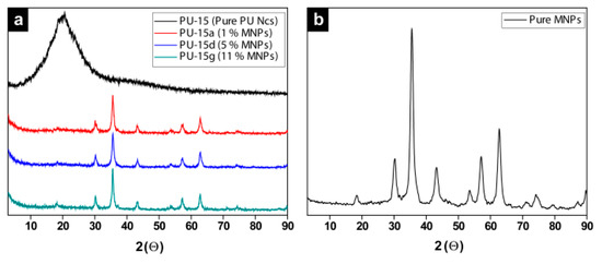 The composition of the PU NCs, pure MNPs, and MNPs-IL-C4@PU NCs was also probed by X-ray powder diffraction (XRD). The XRD pattern of PU NCs (PU-15) displayed a broad peak in the range 2θ = 10–30°, which is attributed to the amorphous polyurea. The XRD of PU-15a, PU-15d, and PU-15g revealed the presence of amorphous polyurea and showed the characteristic peaks of MNPs at 2θ = 18.1°, 30.2°, 35.6°, 43.2°, 53.6°, 57.2°, and 62.8° (Figure 13).