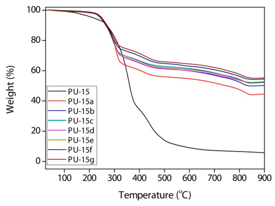 The thermogravimetric analysis (TGA) of pure PU NCs and MNPs-IL-C4@PU NCs (1–11%) over a temperature range of 25–950 °C under an inert atmosphere and at a heating rate of 10 °C/min revealed that pure PU NCs (PU-15) have two degradation steps with a total 94.7% weight loss (Figure 14). The first decomposition step was observed at 125–390 °C, which is attributed to the initial decomposition of the PU shell, toluene, and water [30,37]. The second step, which was at a temperature higher than 390 °C, is attributed to the additional decomposition of PU. The TGA curves of MNPs-IL-C4@PU NCs revealed that when the 1, 2, 3, 5, 7, 9, or 11 wt% of MNPs per aqueous phase was added during the encapsulation process, the measured weight percentage of MNPs was 45.02%, 50.59%, 52.63%, 52.79%, 53.03%, 54.85%, or 55.64%, respectively. Moreover, TGA gives an indication of the stability of the PU NCs. It was clearly seen that all MNPs-IL-C4@PU NCs systems exhibited three degradation steps with the initial decomposition temperature at ~220 °C. This indicates that the presence of MNPs-IL-C4 increased the thermal stability of the PU NCs. The degradation steps at 220–500 °C and >500 °C are attributed to the decomposition of the PU shell and the IL group attached. Theoretically, pure PU should exhibit a 100% weight loss, since it is composed of pure organic material. However, PU-15 revealed the presence of 5.3% of non-decomposable material, which could be attributed to the inorganic surfactant ABIL-EM 90 and some species formed during the heating process.