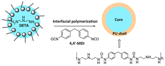 The formation of polyurea through interfacial polymerization between diethylene triamine (DETA) and diphenylmethane-4,4′-diisocyanat (4,4′-MDI).