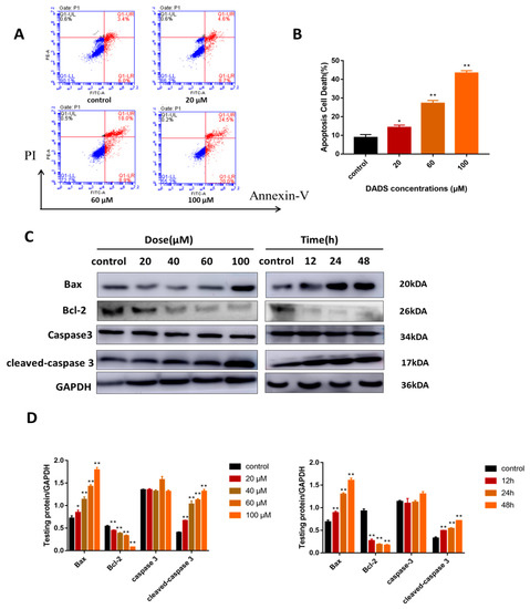Induces caspase-dependent apoptosis in MG-63 cells. (A,B) After cells were stained by Annexin V-FITC/PI and left in dark at room temperature for 15 min, the apoptosis rate was measured by flow cytometry. Data were presented as means ± SD (n = 3). (C,D) Cells were treated with different doses of DADs for 24 h or incubated with DADs (60 μM) for various hours. The apoptosis-related proteins caspase-3, cleaved-caspase 3, Bax, and Bcl-2 were measured by Western blot. GAPDH was used as a loading control. (* p < 0.05, ** p < 0.01 compared with control group).