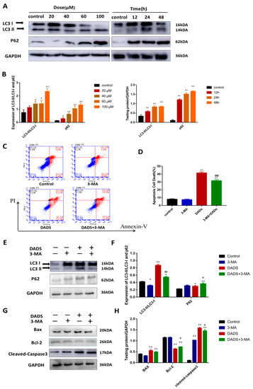 Triggered autophagy flux of MG-63 cells, and inhibition of autophagy reduces DADs-induced apoptosis. (A,B) Cells were treated with different dose of DADs for about 24 h or incubated with DADs (60 μM) for various hours. Western blotting was used to analyze protein expression, and antibodies against LC-3-I, LC3-II, and p62 were tested. (* p < 0.05, ** p < 0.01 compared with control group). (C,D) Cells were pretreated with 3-MA (2.5 mM) for 2 hours and then treated with 100 μM DADs for 24 h. Apoptosis was measured by flow cytometry. The proportion of apoptotic cells from three independent experiments was shown by histograms. (E,F) Western blot showed the expression of apoptosis-related proteins LC3 and p62 with DADs or 3-MA treatment. (G,H) The Western blot results showed that caspase-3, Bax, and Bcl-2 protein expression levels after 3-MA treatment compared with that in the DADs only treatment groups. GAPDH was used as load control. (* p < 0.05, ** p < 0.01 compared with the control group, # p < 0.05, ## p < 0.01 compared with only DADs treated group).