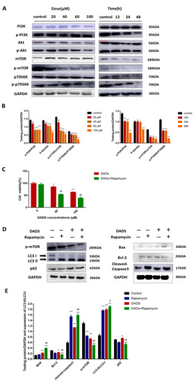 Previous studies have confirmed that PI3K/Akt/mTOR is a signaling pathway that has a negative regulatory effect on apoptosis and autophagy. Inhibiting the mTOR pathway promotes autophagosome formation during the early stage. Therefore, we examined whether DADs stimulates autophagy by detecting activation of mTOR. As shown in Figure 4A,B, the Western blot results indicate that after treatment with DADs for 24 h, the expression of PI3K was decreased and, at the same time, the decrease in the phosphorylation of AKT protein was observed. We further observed that the exposure of MG-63 cells to DADs decreased the phosphorylated (activated) form of mTOR as well as its downstream effectors p70S6K and p-p70S6K proteins compared with that in the control group. The CCK8 assay results showed that rapamycin (mTOR inhibitor; 100 nM) significantly increased the inhibitory effect of DADs on cell viability (Figure 4C). A Western blot analysis revealed that the level of LC3-II increased compared to that in cells treated with DADs alone, whereas there was almost no difference in the level of the p62 protein. Apoptosis-related proteins increased after rapamycin treatment compared with that in the DADs group (Figure 4D,E).