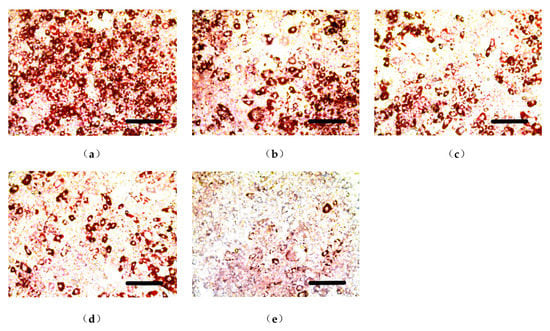 Effect of a shihunine-rich extract of Dendrobium loddigesii (DLS) on the differentiation of a 3T3-L1 preadipocyte stained by Oil Red O. Scale bars equal to 200 μm; (a) Mod group: fully differentiated 3T3-L1 adipocyte; (b–e) DLS groups: fully differentiated 3T3-L1 cells treated with DLS at 2.03, 4.06, 8.12, and 16.25 μg/mL, respectively.