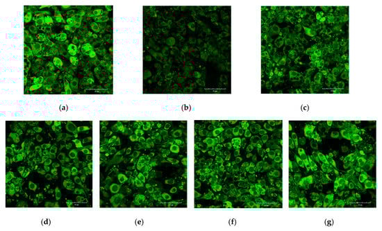 Effect of a shihunine-rich extract of Dendrobium loddigesii (DLS) on the 2-[N-(7-nitrobenz-2-oxa-1,3-diazol-4-yl)amino]-2deoxyglucose (2-NBDG) uptake of insulin-resistant (IR)-like 3T3-L1 cells by laser confocal scanning microscopy. Scale bars equal to 50 μm; (a) Con group: fully differentiated 3T3-L1 cells; (b) Mod group: IR-like 3T3-L1 cells; (c) positive drug group: IR-like 3T3-L1 cells treated with 3.92 μg/mL pioglitazon; (d–g) DLS groups: IR-like 3T3-L1 cells treated with DLS at 2.03, 4.06, 8.12, and 16.25 μg/mL, respectively.