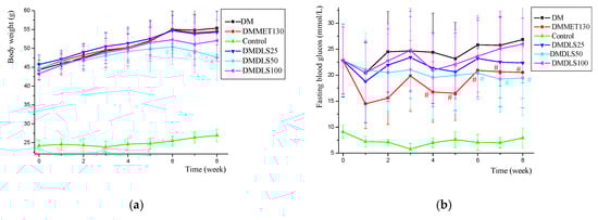 Figure 6a shows that the body weight of all experimental mice increased gradually, while that of the db/db mice was relatively heavy and that of the control group was comparatively light. The body weights of the DM, DMDLS25, and DMMET130 groups were similar across time, and that of the DMDLS100 group was slightly decreased. Compared with the DM group, the body weight of the DMDLS50 group was significantly reduced after 6 weeks of DLS treatment (p < 0.05) and was decreased by 16.4% at the 8th week (p < 0.05).