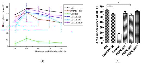 Figure 7 shows that the OGTT of the control group was the minimum value, and that of the DM group was the maximum value. The OGTT of the DMMET130 group was significantly ameliorated (p < 0.05) compared with the DM group, but the OGTT amelioration of the DMDLS25 and DMDLS100 groups was not obvious. Compared to the DM group, the OGTT of the DMDLS50 group was lowered by 18.5% (p < 0.05) and showed effective improvement after 8 weeks of treatment, which was close to that of the DMMET130 group.