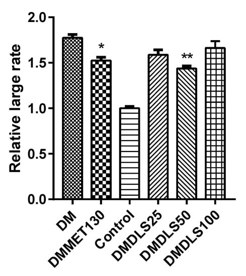 The adipocyte size in the control group was in a normal state (Figure 8c and Figure 9). In comparison with the control group, the adipocyte size of the DM group increased by 74%, in the DMMET130 group by 53%, in the DMDLS25 group by 59%, in the DMDLS50 group by 44%, and in the DMDLS100 group by 66%. Figure 8 and Figure 9 reveal that the increase in the size of adipocytes in the DMMET130 and DMDLS50 groups was significantly repressed after 8 weeks of treatment with metformin or DLS (p < 0.05 or 0.01 vs. DM group). The DMDLS50 group showed the best effect on minifying adipocyte size among the treatment groups.