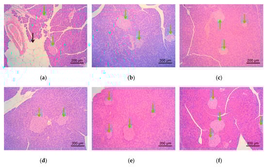 Effect of a shihunine-rich extract of Dendrobium loddigesii on the pancreas of mice; the representative areas of adipocyte infiltration are indicated via black arrows; some islets are indicated via green arrows; (a) no-treatment diabetes mellitus (DM) group; (b) DMMET130 group; (c) no-treatment C57BL/6 mice (control group); (d) DMDLS25 group; (e) DMDLS50 group; (f) DMDLS100 group.