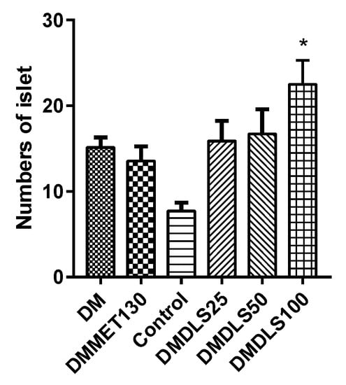Under an inverted microscope, partial adipocyte infiltration or vacuolar degeneration of the pancreatic cells was observed in the DM group (Figure 10a), which were improved in the mice treated with DLS or metformin. Figure 11 shows that the number of islets in the control group was 8.5, fewer than that of db/db mice (13.57 to 22.5), which might be because C57BL/6 mice and db/db mice (BKS.Cg-Dock7m +/+Leprdb/Nju) are different strains. After 8 weeks of DLS treatment, the islets numbers of DLS groups were increased with a dose–effect relationship, in which the DMDLS100 group displayed the highest numbers of pancreatic islets, 22.5, and significantly higher than those of the DM group (p < 0.05).