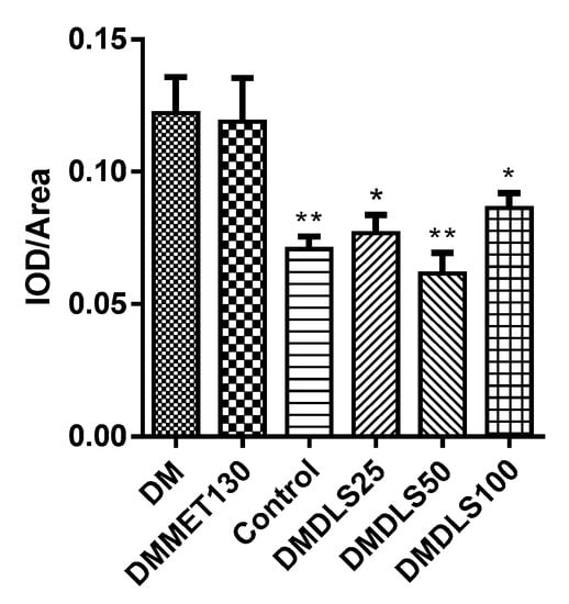 The expression level of cleaved caspase-3 in the DM group was higher than in other groups (Figure 12a and Figure 13). Compared with the DM group, the cleaved caspase-3 expression level in the DMMET130 group was not improved, but that in three DLS groups was dramatically decreased (p < 0.05 or 0.01). The cleaved caspase-3 expression level of the DMDLS50 group was similar to that of the control group and decreased by 50% compared to the DM group.