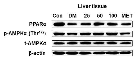 Effects of a shihunine-rich extract of Dendrobium loddigesii on the protein expressions of PPARα, p-AMPKα, and AMPKα in the mice liver tissue by Western blot analysis. β-actin: reference protein; Con: control group, no-treatment C57BL/6 mice; DM: no-treatment db/db mice; MET: DMMET130 group, db/db mice treated with metformin at a dose of 130 mg/kg; 25, 50, and 100: DMDLS25, DMDLS50 and DMDLS100 groups, db/db mice treated with DLS at three dosages of 25, 50, and 100 mg/kg, respectively.