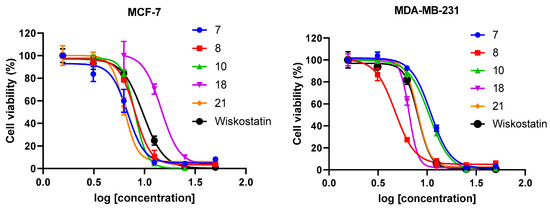 Log-dose response curve for compounds 7, 8, 10, 18, 21, and Wiskostatin on MCF-7 and MDA-MB-231 breast cancer cell lines. Each data point represents the mean of three replicates and error bars represent ± SD. Each GI50 value was calculated based on sigmoidal curve fitting to the respective data set.