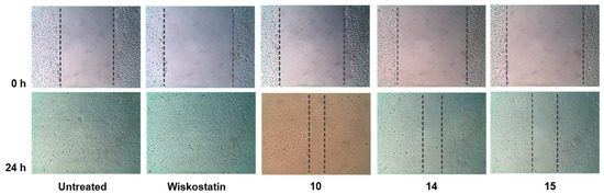 Inhibitory effect of compounds 10, 14, 15, and Wiskostatin on MDA-MB-231 cells migration detected by wound-healing assay. MDA-MB-231 cells were treated with vehicle or with compounds 10, 14, 15, and Wiskostatin. The photomicrographs were obtained at 0 and 24 h. Percent relative migration values are the average of three independent experiments. Dotted lines show the area occupied by the initial scraping for 0 h, and the wound edge for 24 h.