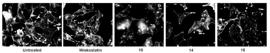 The Rho GTPases are believed to stimulate plasma membrane protrusion by inducing actin filament nucleation and polymerization on or close to membranes [43]. In particular, the Rho GTPase protein Cdc42, through activation of N-WASP/Arp2/3 pathway, is an important mediator of actin polymerization and filopodium extension [44,45]. Therefore, compounds that interfere with this process might be potentially useful molecular probes for the study of cell migration and invasion. To determine changes in actin cytoskeletal structures, we treated MDA-MB-231 breast cancer cells with vehicle or compounds 10, 14, 15, and Wiskostatin at 10 µM for 24 h (Figure 4).